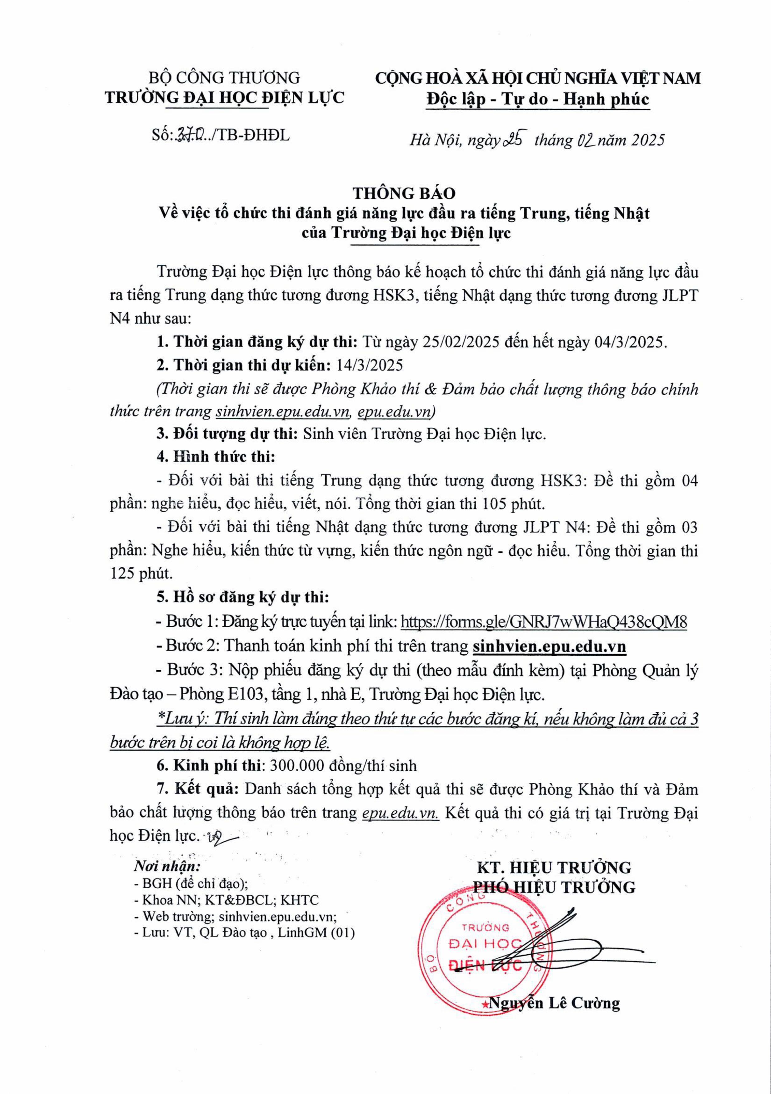 Thông báo v/v tổ chức thi đánh giá năng lực đầu ra tiếng Trung, tiếng Nhật, của Trường Đại học Điện lực