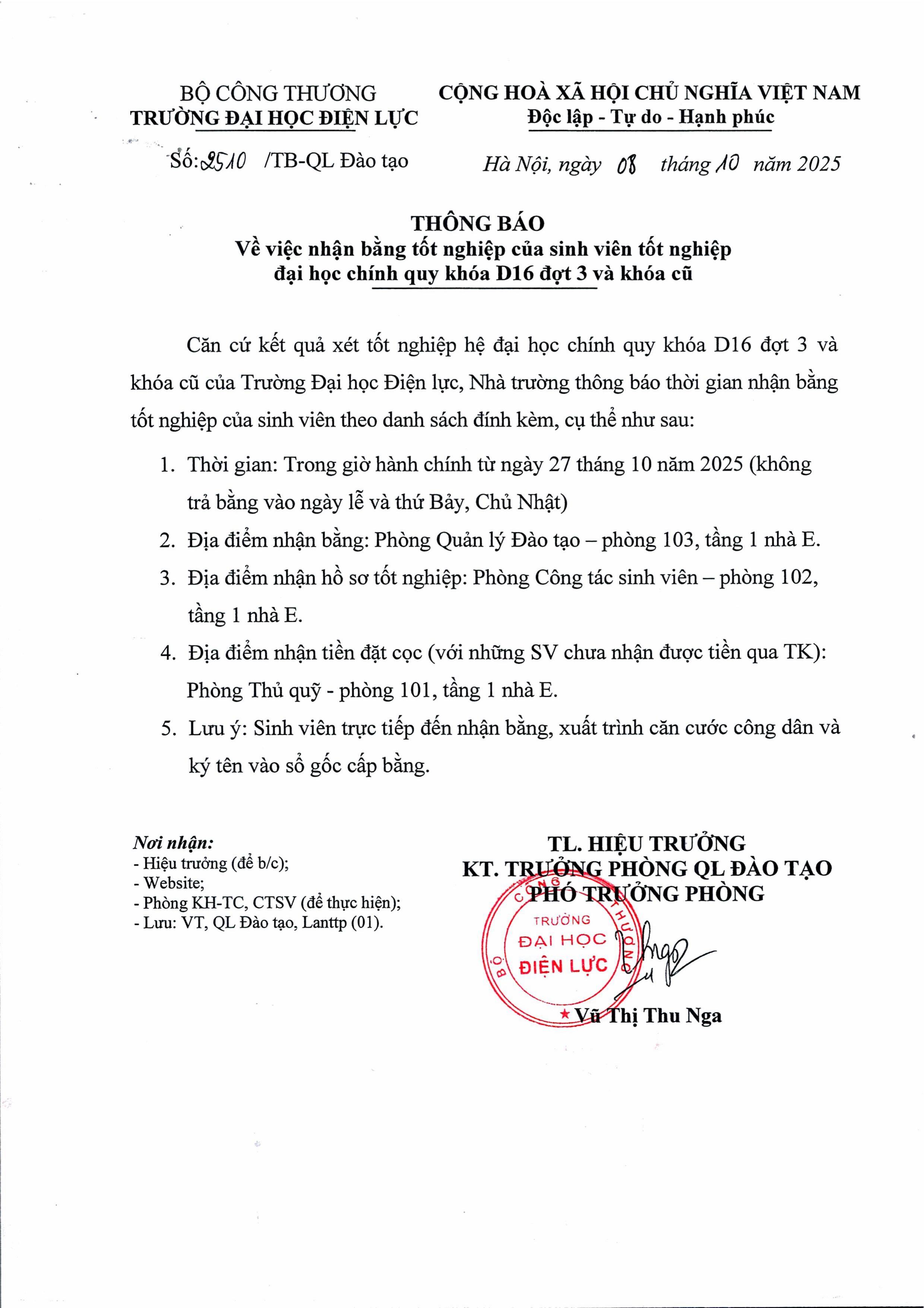 Danh sách sinh viên nhận bằng tốt nghiệp khóa D16 đợt 3 và khóa cũ xem tại đây (Click here)