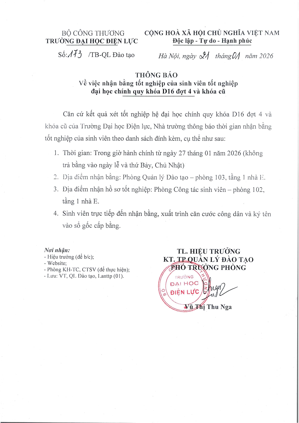 Danh sách sinh viên nhận bằng tốt nghiệp đại học chính quy khóa D16 đợt 4 và khóa cũ sinh viên xem tại đây (click here)