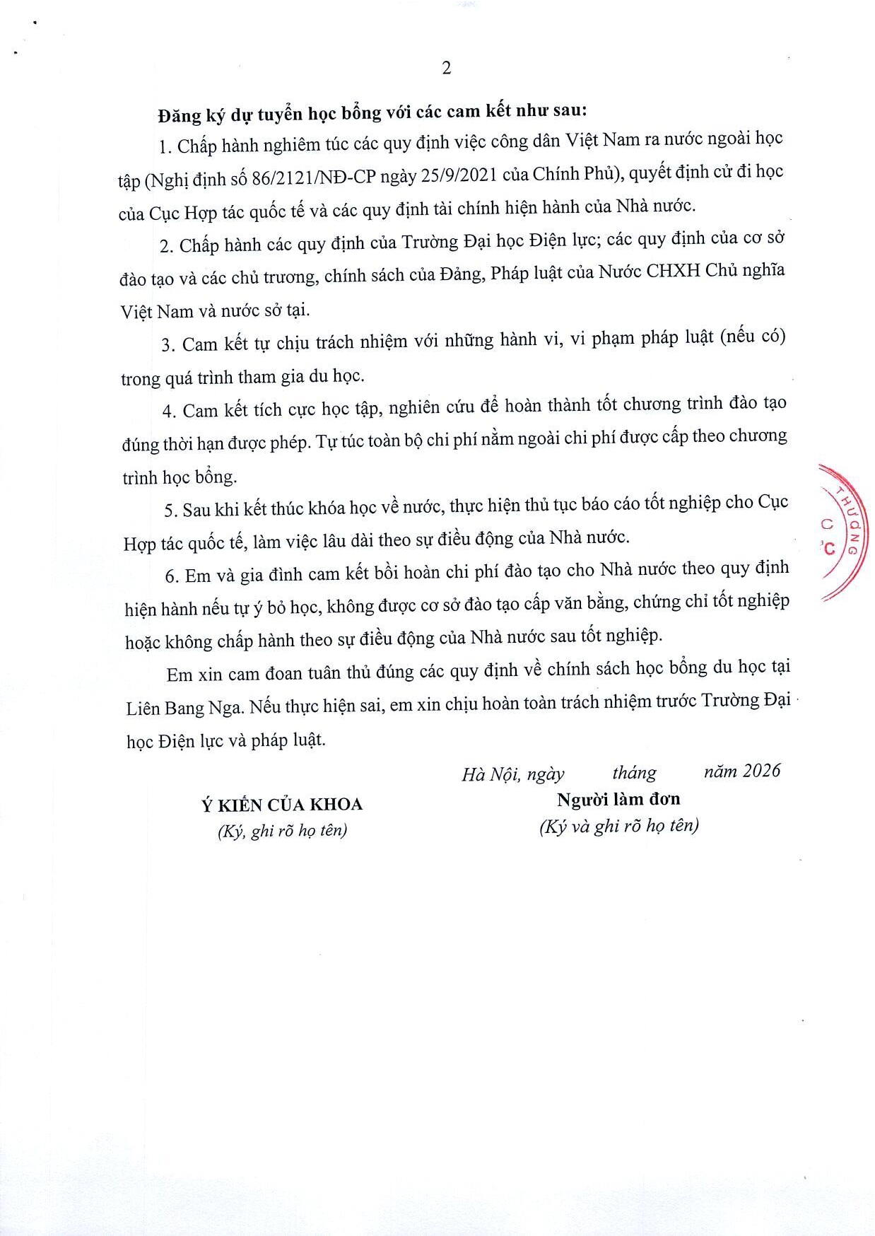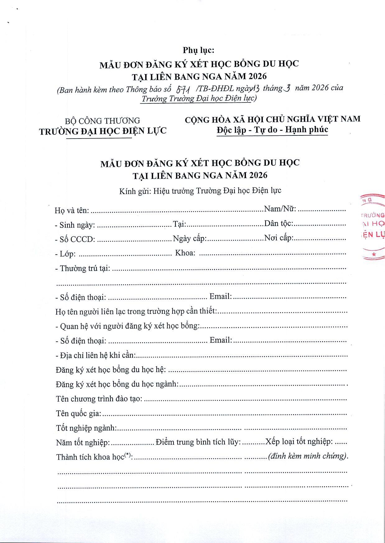 Mẫu đơn đăng ký xét học bổng du học tại Liên Bang Nga (click here)